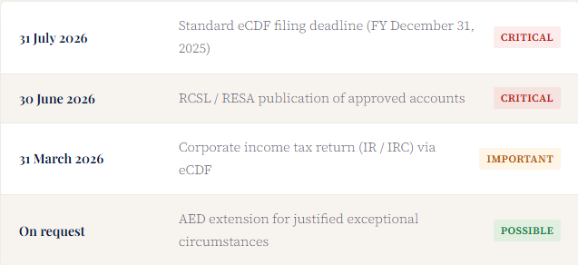 Late filing penalties: Failure to file before the deadline may result in AED administrative penalties and, in persistent cases, the RCSL may initiate dissolution proceedings under the amended Companies Act.